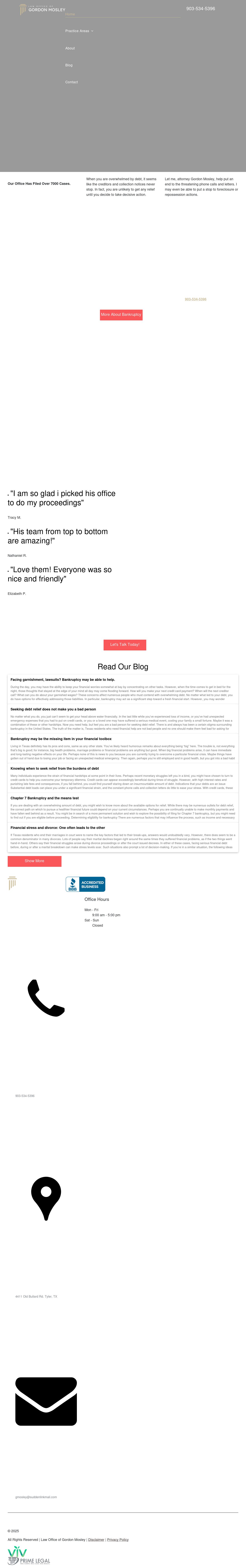 Law Office of Gordon Mosley Tyler Texas Bankruptcy Lawyer We help consumers and small businesses get the fresh financial start they need through bankruptcy. Call 903-266-1843 for a free consultation.